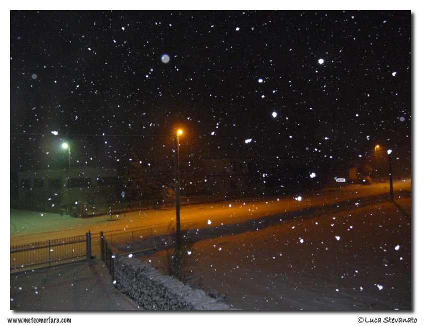 Nella notte il forte vento si calma e la nevicata aumenta d'intensità. Fra le 5 e le 6 del mattino scendono circa 10 cm di neve in un'ora con un eccezionale snowrate di 10cm/h! L'accumulo si porta a 18 cm. Continua a nevicare sino alle 11 arrotondando l'accumulo finale a 20 cm.