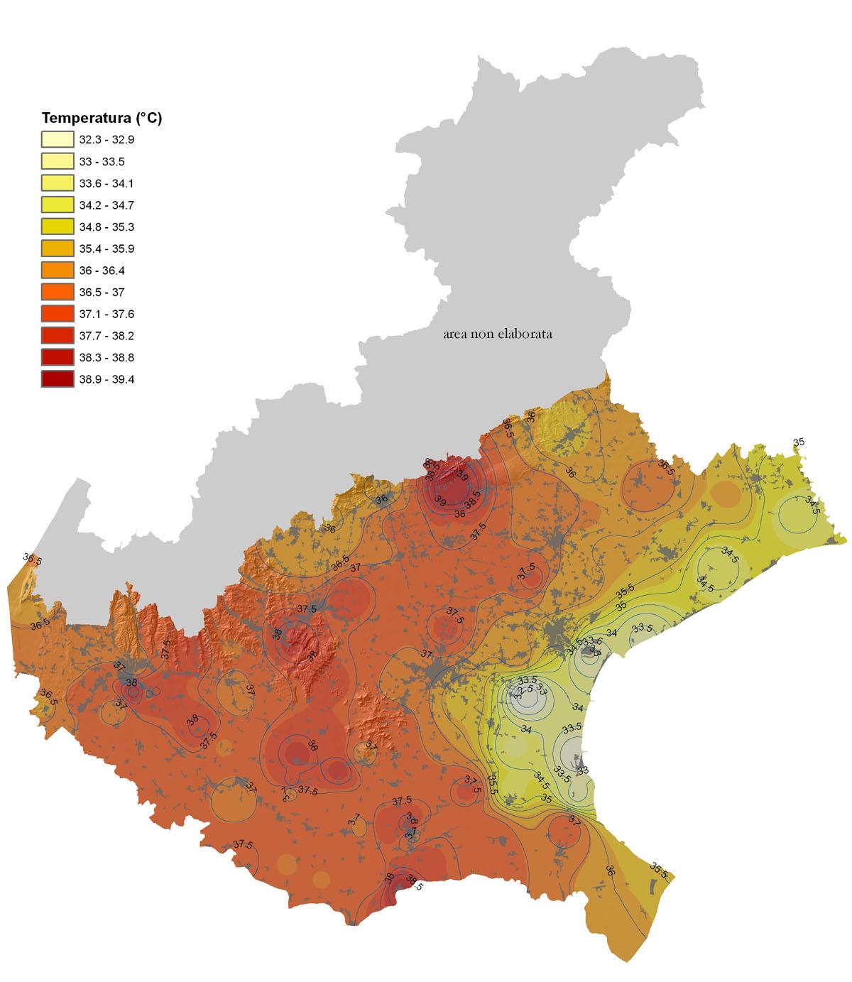Mappa delle temperature massime raggiunte in Veneto il giorno 18-19-20 Luglio 2007