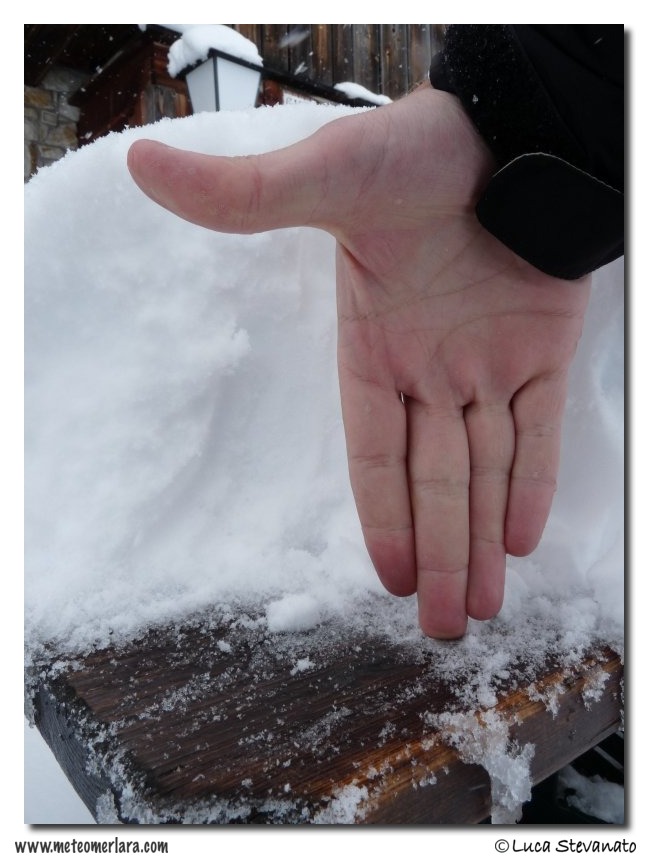 La neve sul tavolo, la mia mano in verticale misura 28 cm (vi assicuro che ho la mano gigante!)